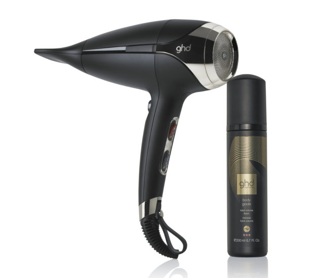 Pour des résultats maximisés et du volume jusqu’à 24h*, nous vous recommandons d’associer la mousse total volume au sèche-cheveux ghd helios.